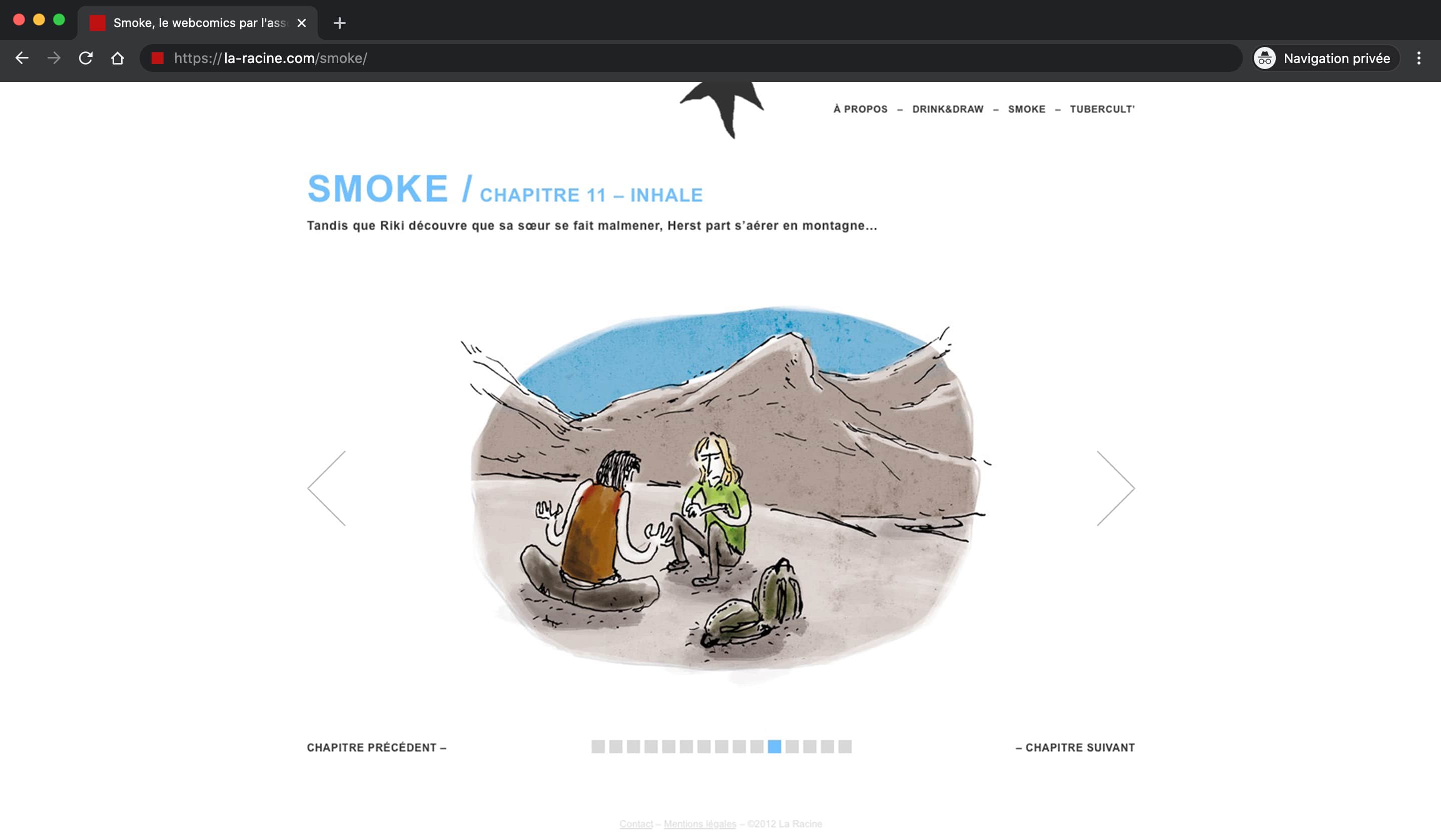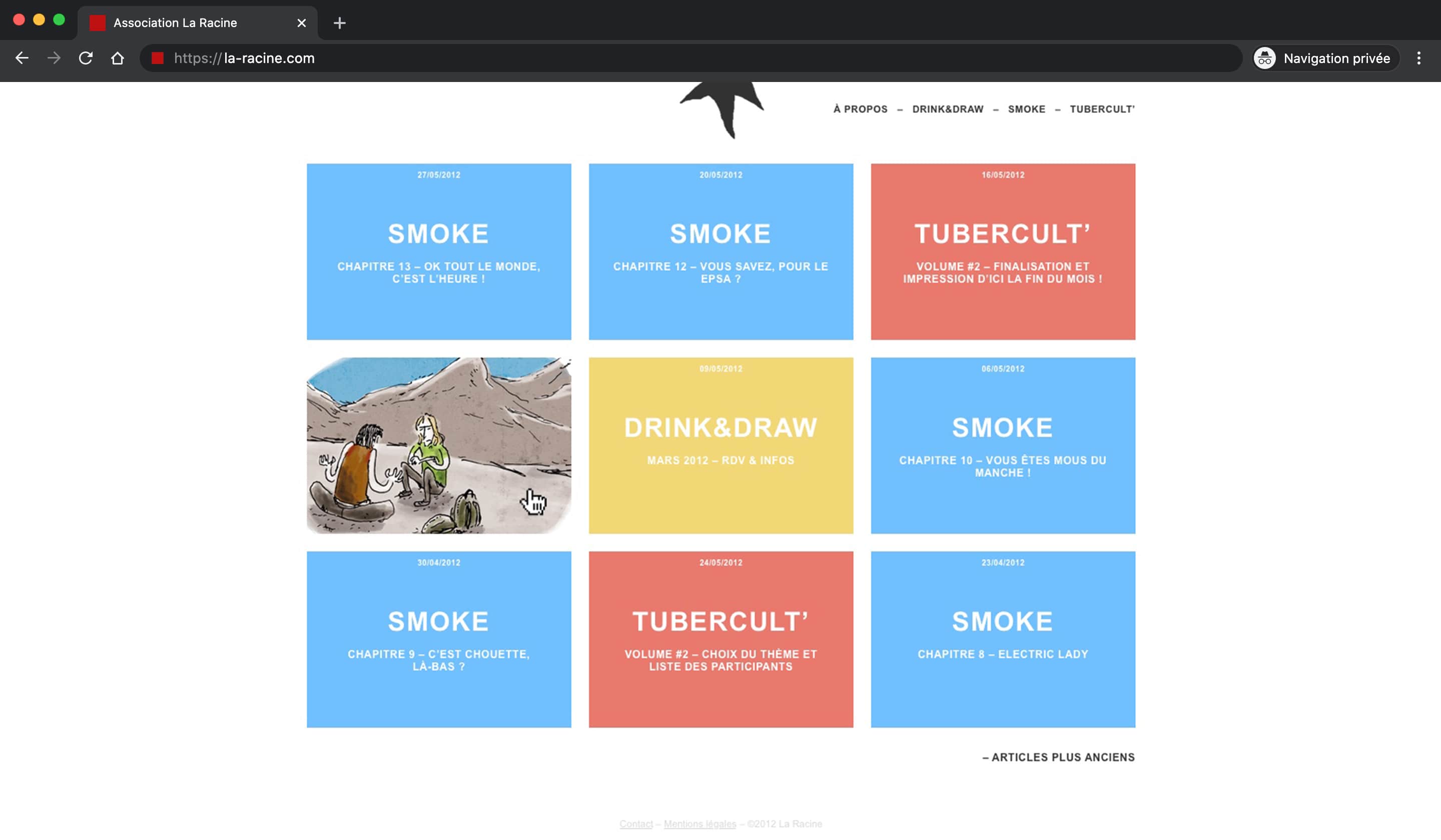 ⁕⁕⁕La Racine was a non-profit organization. Its purpose was to reunite young people of the visual world to work together. Comics makers, illustrators, photographers joined the challenge and three projects have born from their mind and hands : a revue printed every three months, a webzine weekly updated and Drink&Draw parties every month that were opened to anyone. As President for two years, I managed the team and the workload, organized events and taked part of the visuals production.